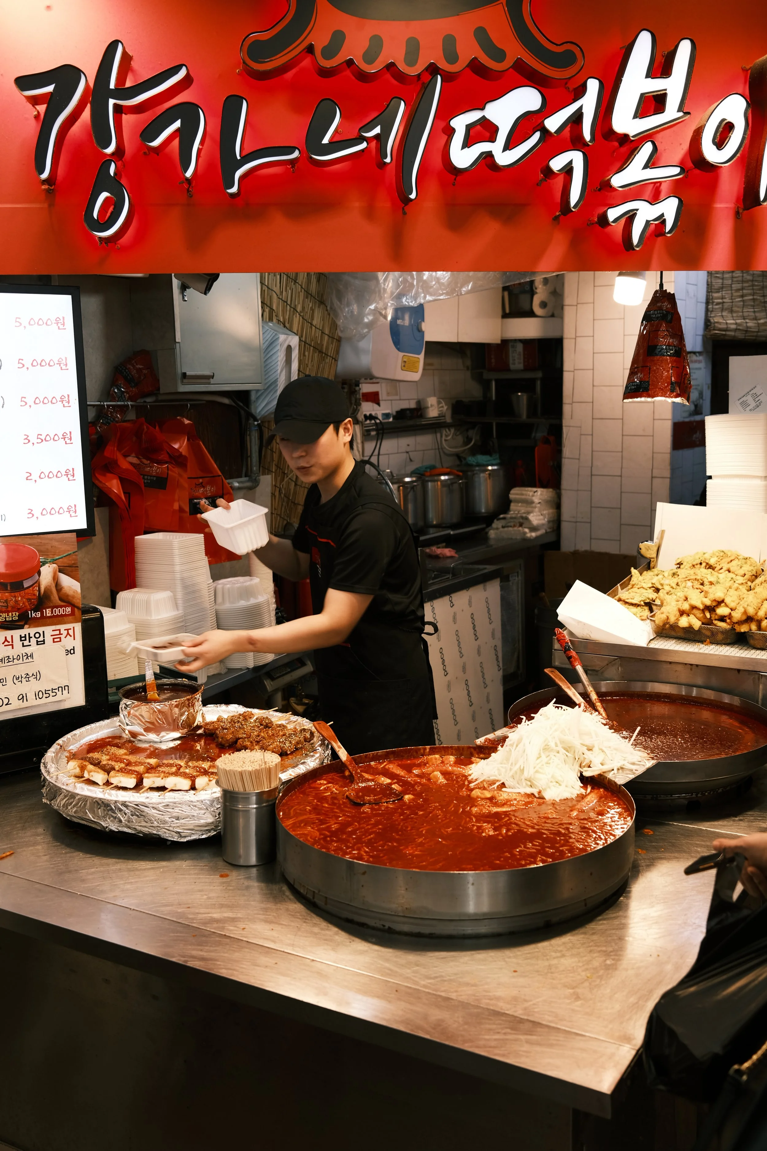 Tteokbokki is a cheap and beloved street food made with rice cakes and sausages, simmered in a gochujang sauce.