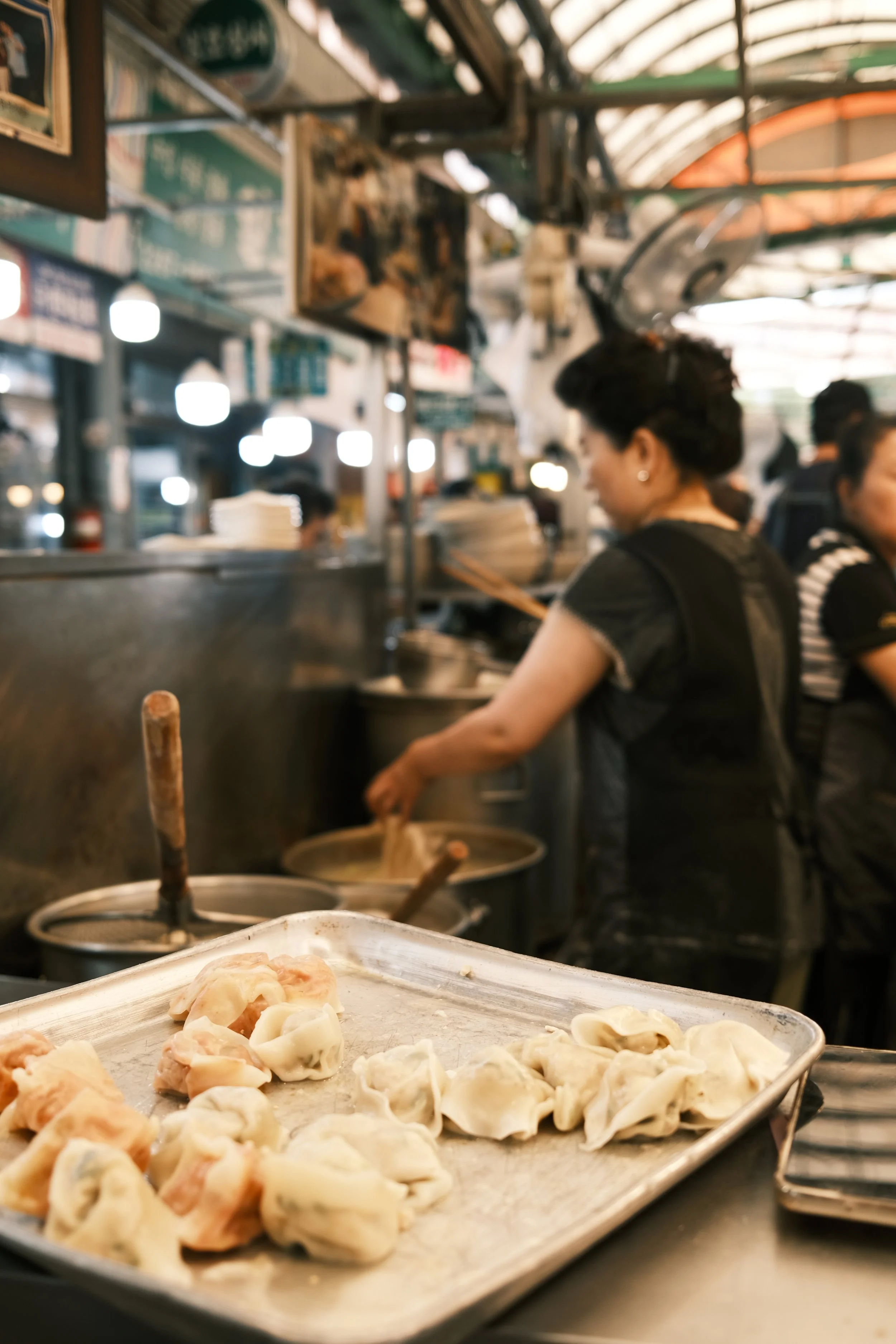 This stall makes fresh dough for dumplings and noodles right in front of you.