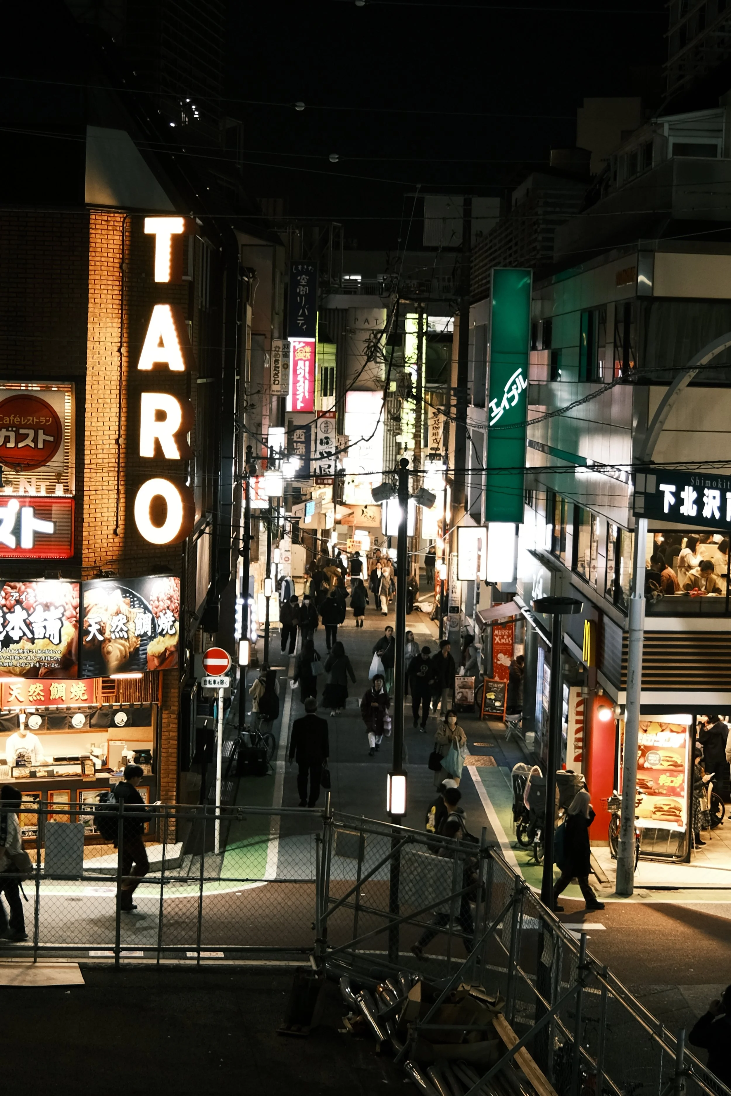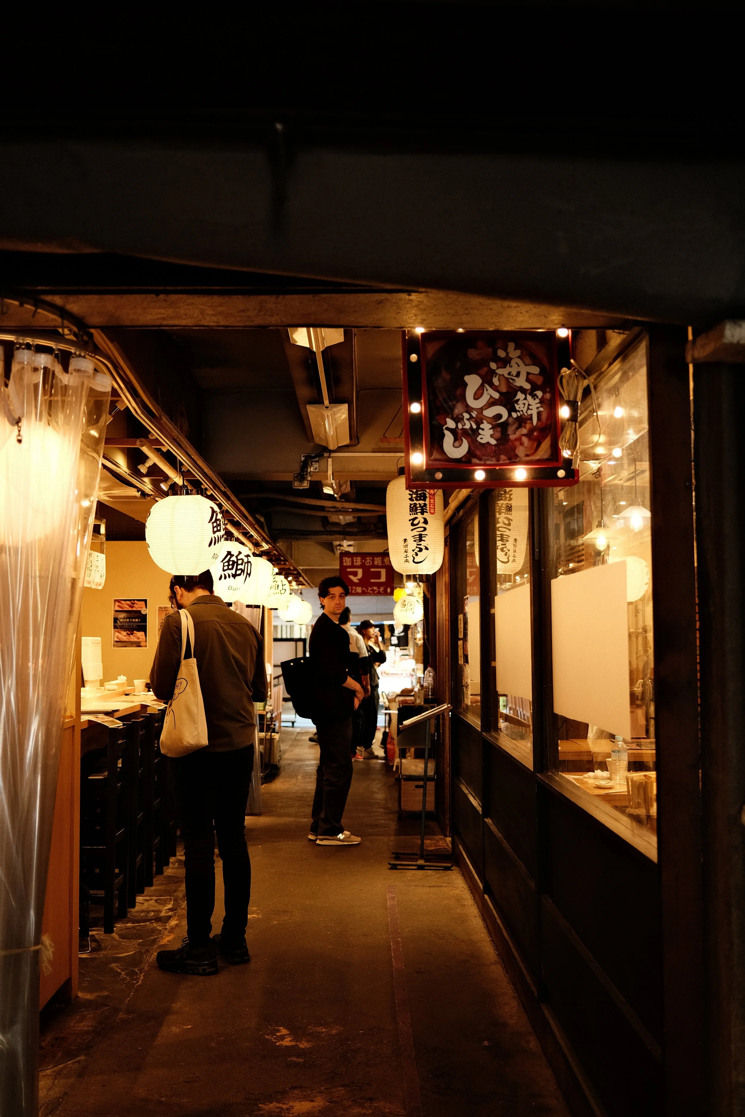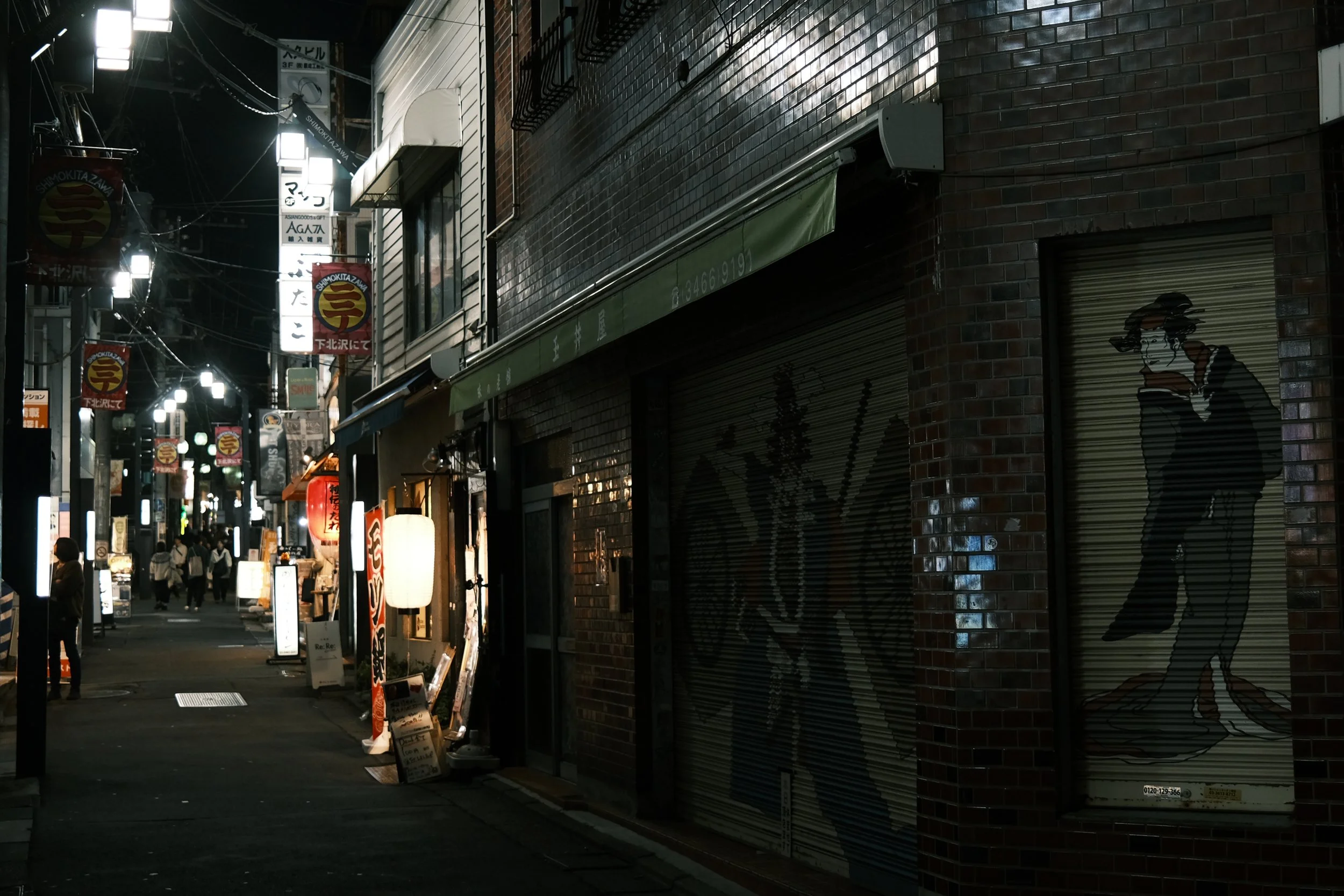 The back alleyways are lined with lanterns indicating bars and restaurants.