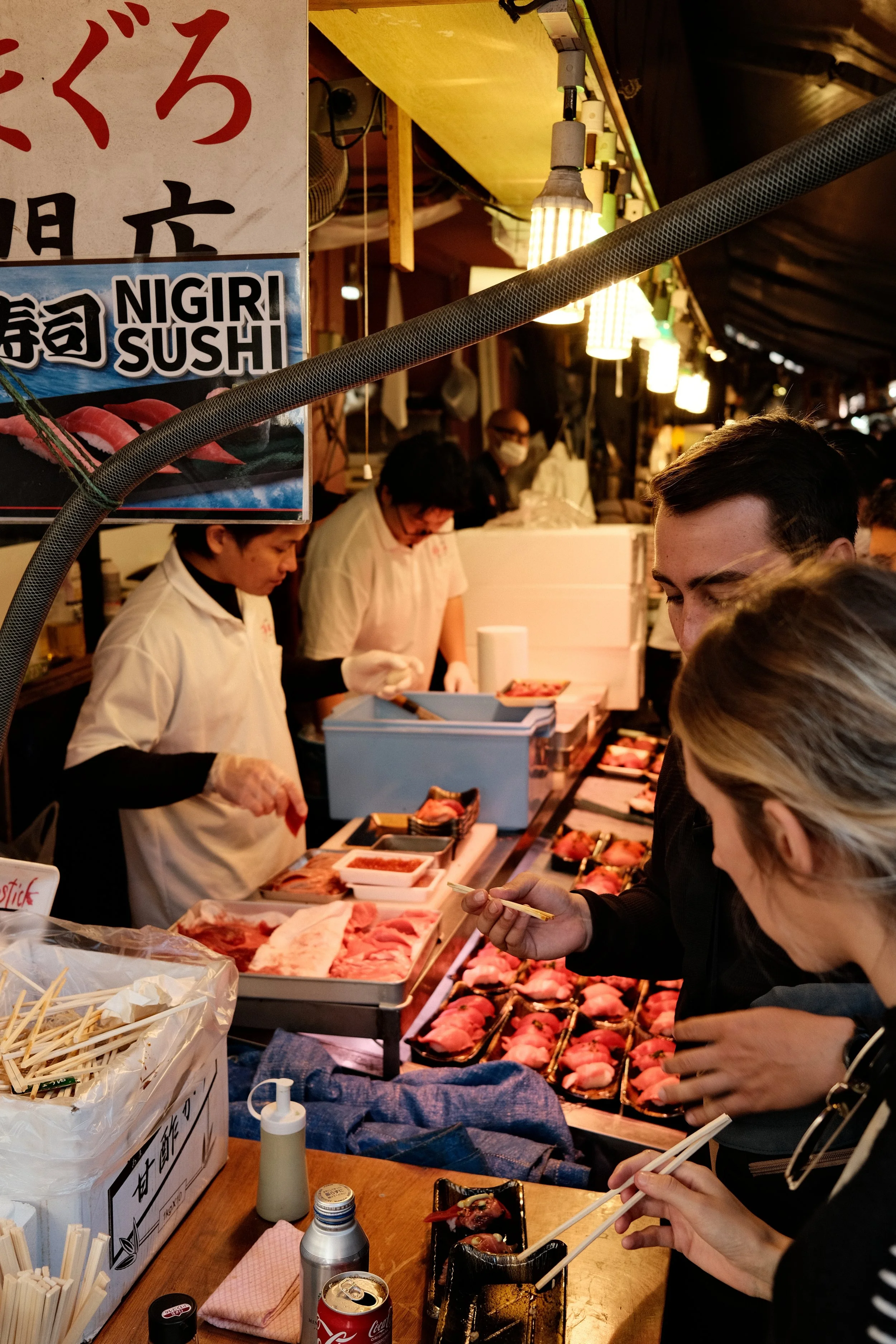 The outdoor market is lined with fishmongers selling freshly caught whole fish or sushi.